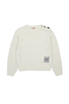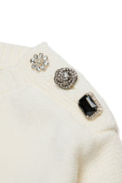 着心地の良さとスタイリッシュさを併せ持つ、逆畦編みのウール混プルオーバー。肩にあしらわれた3つのビジューボタンはそれぞれ異なるデザインで、エレガンスとオリジナリティを添え、個性的で洗練された一着に仕上がっている。