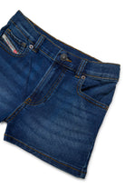 ミディアムブルーのデニムショートパンツ、ベーシックなラインとコントラストステッチ。