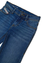 コントラストステッチ入りのミディアムブルー スキニージーンズ。