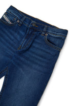 ミディアムブルーデニムのコントラストステッチ入りスリムフィットジーンズ。