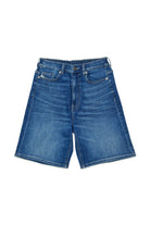 ウォッシュ加工を施したデニムショートパンツ、コントラストカラーのステッチ入り。