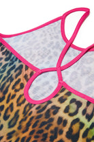 マルチカラーのアニマルプリントとロゴ入りカバーアップ。コントラストの効いたパイピングで仕上げられています。ミニシルエットで、背中はクロスしたショルダーストラップが特徴です。