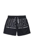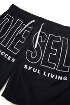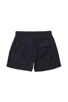 ロゴ入りボクサースタイル水着、フロントに大胆なコントラストプリント