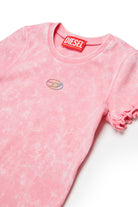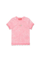 ロゴ入りスカラップトリムTシャツ。ストレッチコットン素材で、ギャザー仕上げの半袖です。