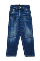フロントに大きなパッチポケットとコントラストステッチが施されたストレートジーンズ。