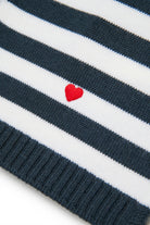 ソフトで暖かいストライプ柄のウール製マフラー。片方の端に施されたハートの刺繍が個性的なアクセントを添えています。