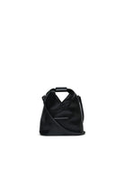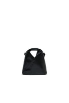 コーティング生地を使用したJapanese Bagロスボディ。三角形のフォルムが特徴的で、バッグの縁にはボタンがあり、折りたたみ方によってバッグの形を変えることができる。袖には数字ロゴ入りのレザーパーツがあしらわれている。MM6を象徴するアクセサリーであり、アダルト・コレクションからの抜粋である。