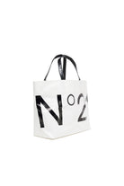 ロゴがプリントされたトートバッグ、コントラストの効いたハンドルで現代的なデザイン。