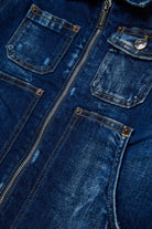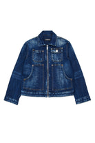 ロゴプリント入りデニムジャケット。フロントポケットとウォッシュ加工のディテールが特徴で、ユニークなスタイルを演出。