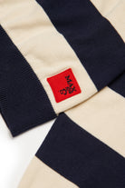 裾にロゴがあしらわれた、ストライプ柄の100%コットンカーディガン。フロントのボタン留めとコントラストディテールが特徴的なアイコニックな一着です。