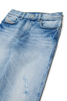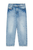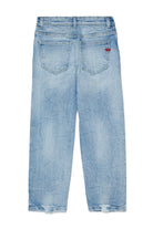 ライトデニムのレギュラーフィットジーンズ、ウィンクル加工とヴィンテージ風ディテール付き。