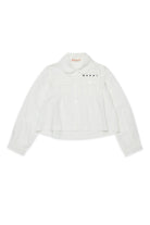 ポプリンの長袖シャツ。ギャザー入りの胸ポケットと刺繍入りの組織ロゴが特徴です。ややアシンメトリーなボトムがデザインにオリジナリティを与えています。