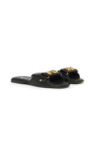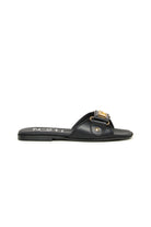 フロントにロゴ付きのメタル製マキシバックルをあしらったサンダル。ミニマルなデザインと薄型ソール。