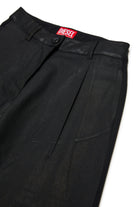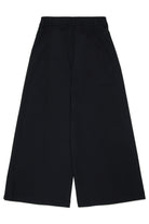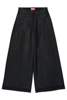 ロゴ入りワイドフォーマルパンツ。モデルはやや光沢のある質感とワイドレッグシルエットが特徴です。