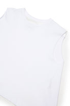 ロゴ入りノースリーブTシャツ、100%コットン製。背面に特徴的な三角形の開きがあります。