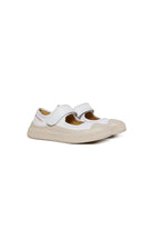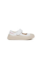 トップにストラップが付いたロータイプのMary Jane・トレーナーです。バックサイドにコントラストカラーでインスティテューショナルロゴがプリントされています。牛革(カーフレザー)アッパーとインナーライニング。熱可塑性ラバーソール。イタリア製。