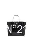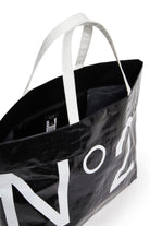 ロゴがプリントされたトートバッグ、コントラストの効いたハンドルで現代的なデザイン。
