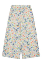 コットン100%のポプリン製ワイドレッグパンツ。ウエストゴム入り。オールオーバーの花柄プリントパターン。フロントにモノグラム紋章の刺繍入り。フラットなフロントポケット。