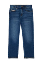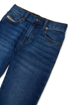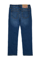 - コントラストカラーのステッチが施されたミディアムブルーデニム