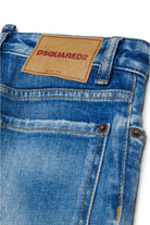 ストレートフィットのBoss 10 5ポケットジーンズ。コントラストカラーのグラデーションとひげが特徴的なミッドブルーデニム製。前身頃裏側に破れと擦り傷。フラップにDsquared2のロゴ入り。