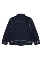 ダークデニムの長袖ジャケット。 生成りのシームと裾。 フロントにポケットとスモールポケット。フロントボタンクロージャー。コットン100%製。