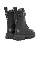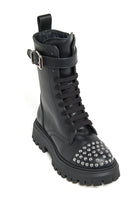つま先に飾り鋲、シャフト上部にバックルストラップをあしらったレザーのコンバットブーツ。どんなスタイルにもロックで大胆なタッチを加える完璧なモデル。