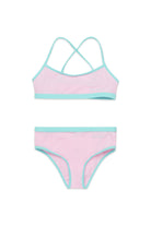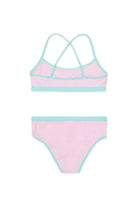 ショルダーストラップがクロスしたライクラビキニ水着。インスティテューショナルロゴとコントラストカラーの裾でカスタマイズできます。