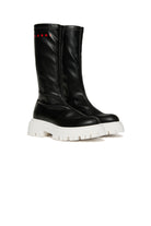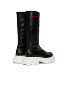 Modern-design long boots. Featuring a contrasting official logo on the sides. Overlock stitching at the top. Faux leather upper. Leather blend lining. Contrasting thermoplastic track sole. A sophisticated design, suitable for less formal occasions. Made in Italy.