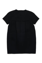 卵型デザインのネオプレーン製ミニハーフスリーブドレス。胸元にあしらわれたフリルが繊細な形の遊びを生み、シルエットを引き立てる。現代的で独創的な一着。