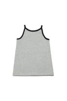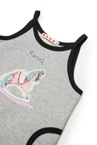 ロゴ付きショートドレス。ノースリーブデザインで、フロントに木馬プリントとコントラストの効いた縁取りが特徴です。