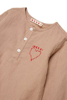 胸元にハート型ロゴの刺繍が施された、コットンとリネンの混紡素材で作られた長袖クルーネックシャツ。
