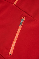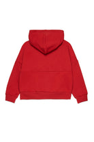 胸元にロゴ入りのフーディー。シルエットはフロントジップとジップ付きポケットが特徴です。