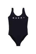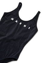 フロントにロゴが入ったワンピース水着。細いストラップと深いバックネックラインが特徴です。