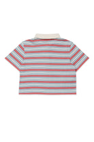 マルチカラーのストライプ柄と胸元に刺繍ロゴをあしらった、100%コットンのポロシャツ。