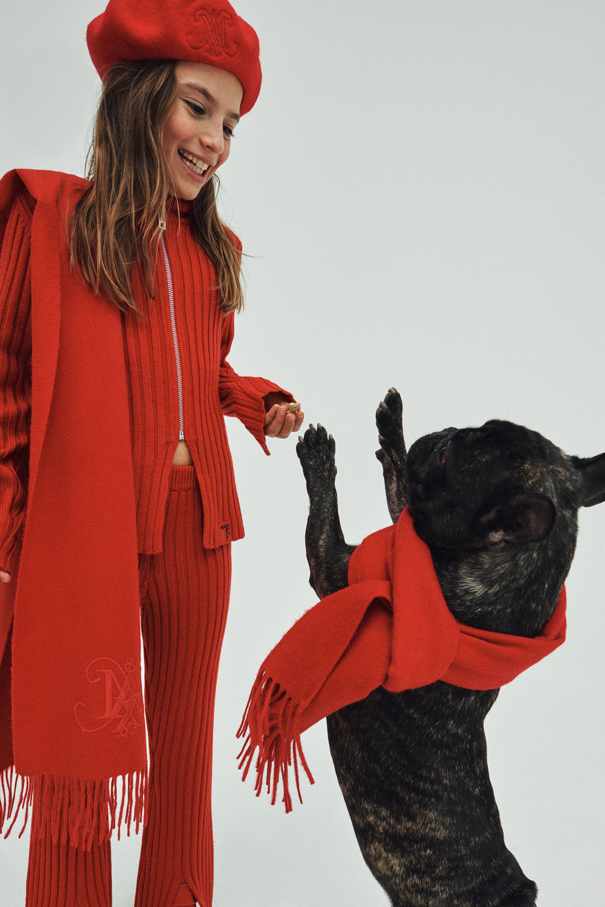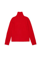 ウール混リブニットのハイネックカーディガン。フロントファスナーで開閉する暖かく実用的なデザインで、ワッペンとフロントスリットがラインを強調します。