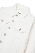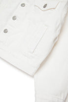 ロゴプリントとアイコニックなバックステッチが施されたデニムジャケット。メタルボタンと胸元のパッチポケット付きデザイン。