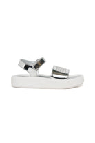 コントラストロゴ付きミラーエフェクトのメタリック仕上げサンダル。