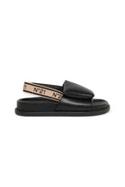 バックにN°21のロゴ入りゴムがあしらわれたサンダルです。クロスオーバーデザインで、アッパーはフワフワした素材。アッパーストラップクロージャー。熱可塑性ラバーソール。イタリア製。
