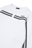 ダイナミックな印象を与える、胸元と袖にジップ付きバンドとロゴを配したクルーネックスウェット。