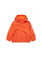 ロゴプリント入りウインドブレーカー、固定フード、シンプルなシルエット。