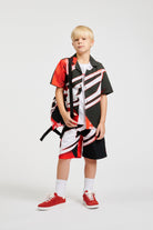 ロゴ入り半袖シャツ。全体に抽象的なグラフィックプリントが施され、ピュアコットンで作られています。