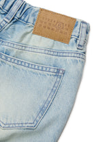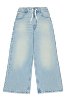 ライトブルーデニムのフレアジーンズ。五つのポケットと、レギュラーウエスト、後部にゴム仕様のデザインです。アイコニックなバックステッチ入り。