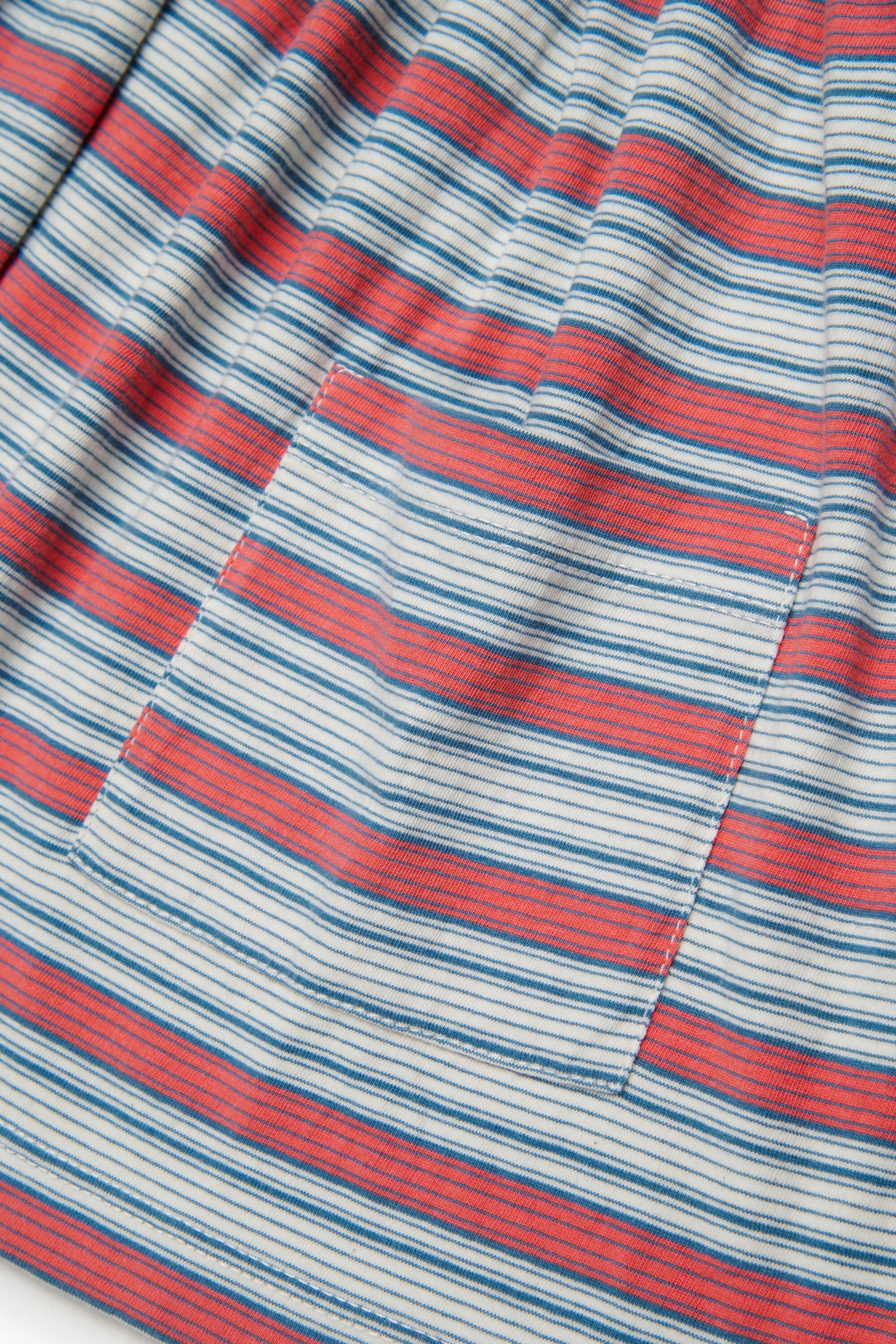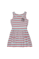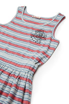 ロゴとストライプ柄のショートドレス。袖なしトップとパッチポケットのディテールが特徴です。