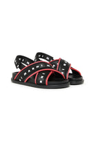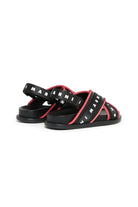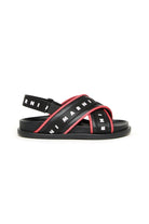 クロスバンドにロゴ入り、コントラストの効いた縁取りのサンダル。