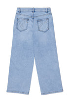 コントラストステッチとバックポケットの刺繍が特徴的なライトデニムのリラックスジーンズ