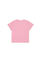 100%コットンのTシャツ、胸元にロゴプリント。