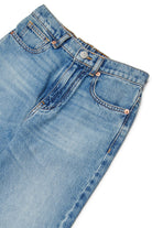 ライトブルーウォッシュのデニムを使用したレギュラージーンズ。裾のスリットが特徴的なディテール。