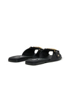 フロントにロゴ付きのメタル製マキシバックルをあしらったサンダル。ミニマルなデザインと薄型ソール。