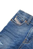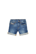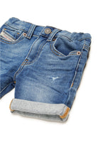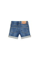 JoggJeans®のショートパンツ。グラデーション、ひげ、コントラストカラーのシームが特徴的なソフトハンドルのミッドブルーデニム製。フロントにジグザグのリペア加工。裾はロールアップ。