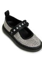トップにロゴ入りのストラップが付いたローヒールのMary Janeシューズ。キャンバス生地のアッパー全体にラインストーンをあしらっています。牛革(カーフレザー)のインナーライニング。熱可塑性ラバーソール。イタリア製。